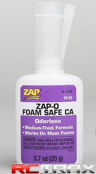 Zap-O-Foam to specjalna bezwonna mieszanka kleju Cyjanoakrylowego CA do pianek. Klej ma średnią konsystencję oraz wiaże w 15 sekund.