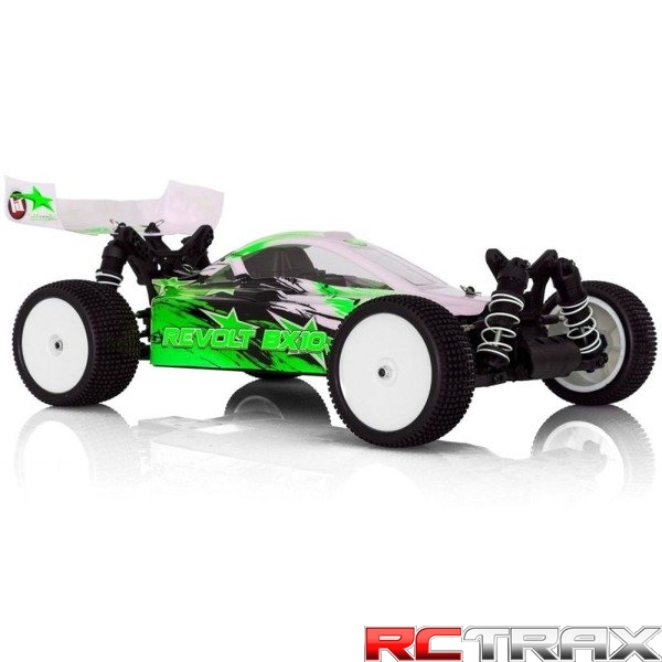 Hobbytech Revolt 4.0 1/10 został wyposażony w silnik szczotkowy oraz regulowane amortyzatory Big Bore, które pozwalają poruszać się po nawet najbardziej wymagającym terenie.