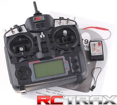 Zestaw zawiera nadajnik FlySky FS-TH9X 9CH 2.4GHz, odbiornik FS-R9B 9CH, moduł nadawczy FS-RM002 oraz instrukcje obsługi w języku obcym.