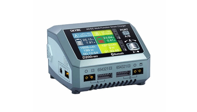 Urządzenie SkyRC zostało wyposażone w podwójne porty, które działają niezależnie, zapewniając efektywne i równoczesne ładowanie dwóch akumulatorów. Co więcej, D200neo oferuje elastyczność wyboru między wejściem AC i DC, dostosowując się do różnych scenariuszy. W trybie AC zapewnia on moc ładowania do 200W, podczas gdy w trybie DC, wydajność rośnie nawet do 800W. Dodatkowo możesz wybierać ładowanie prądem stałym o mocy 800W dla największej wydajności, lub skorzystać z ładowania prądem zmiennym o mocy 200W, aby dostosować jego działanie do swoich specyficznych potrzeb. D200neo to absolutna rewolucja w świecie ładowarek RC.
