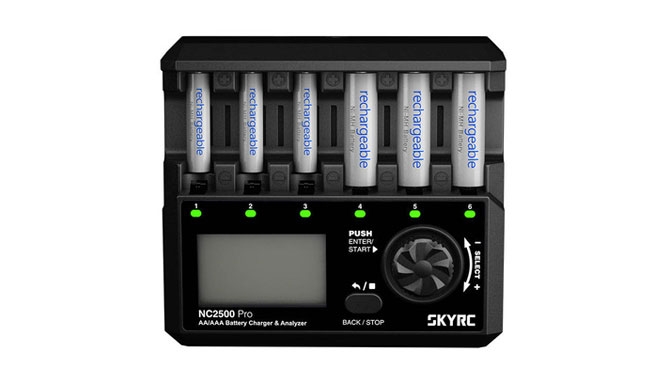 Ładowarka SkyRC NC2500 Pro umożliwia nie tylko ładowanie akumulatorów AA i AAA, ale także ich regenerację. Urządzenie oferuje kilka trybów pracy, a dodatkową zaletą jest funkcja rozruchu, która pozwala na rozruch silników modeli, które nie były używane przez długi czas. Posiada również port USB obsługujący szybkie ładowanie QC 3.0, a ładowarka jest wyposażona w 6 gniazd na akumulatory.