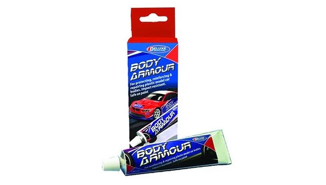 Deluxe Materials Body Armour to wysoce elastyczny klej polimerowy specjalnie zaprojektowany do wzmacniania i naprawy modeli karoserii samochodowych z leksanu narażonych na trudne warunki jazdy modelami samochodów.