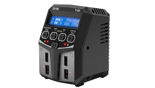 Ładowarka SkyRC T100 to dwukanałowa ładowarka, która jest w stanie naładować lub rozładować wszystkie najpopularniejsze typy akumulatorów. Przemyślana konstrukcja pozwala na bezproblemowe podłączenie do portów balansera i wtyczki XT60. Ładowarka jest niewielka, ale posiada aż 100 watów mocy, które pozwalają na ładowanie akumulatora prądem 5 amperów. Ładowarka posada również tryby ładowania AGM i zimny do ładowania akumulatorów kwasowo-ołowiowych i AGM w niższych temperaturach.