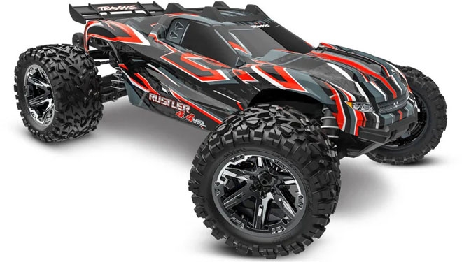 MODEL 67376-4. Rustler 4X4 VXL w pełni zmontowany z wodoszczelną elektroniką, dwukanałowym systemem radiowym TQi ™ 2,4 GHz, systemem Traxxas Stability Management®, regulatorem obrotów VXL-3s i pomalowaną karoserią ProGraphix®.