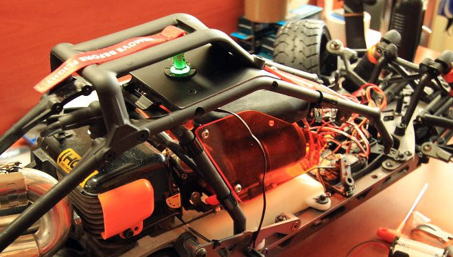 Nad montażem samego wyłącznika dość długo się zastanawialiśmy. W rezultacie wybór padł na daszek nad świecą. Dlaczego ? Z kilku powodów: a) łatwość dostępu do kluczyka, b) stabilny i pewny montaż w grubej metalowej płytce, c) dołożyliśmy przy okazji pałąk od BAJA 5T co zabezpiecza kluczyk przed uszkodzeniem w razie ewentualnego dachowania, d) dodatkowo pałąk od HPI BAJA 5B mniej naraża świecę na uszkodzenie podczas dachowania, niestety oryginalny daszek jest zbytnio spasowany.