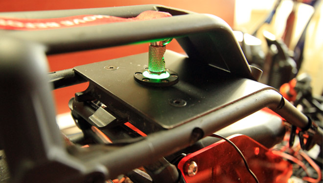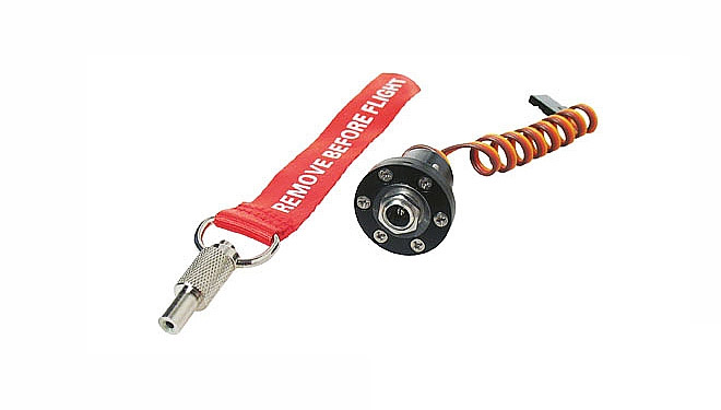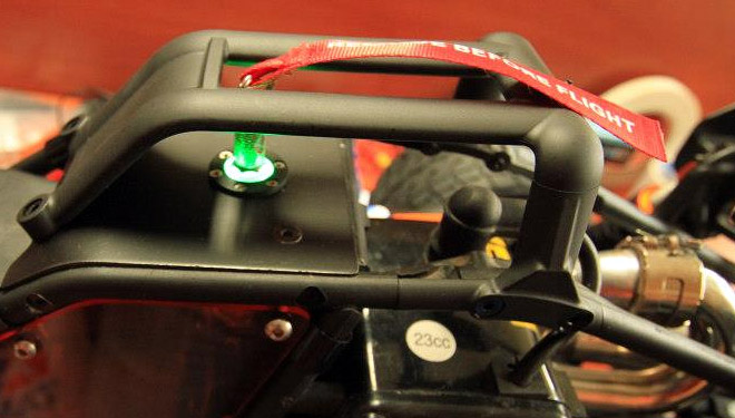 Aby obejść oryginalny, plastikowy włącznik zdecydowaliśmy się na zamontowanie wyłącznika FSS-3 firmy Dualsky. Kluczyk jest z silnym magnesem więc po osadzeniu go w otworze nie ma obaw że wypadnie. Dodatkowo dla 100% pewności smyczkę zamontujemy jeszcze na nita. Po osadzeniu kluczyka w otworze zapala się zielona otoczka z diod na rancie włącznika jako test poprawności połączenia oraz daje to dodatkowy walor estetyczny ;)
