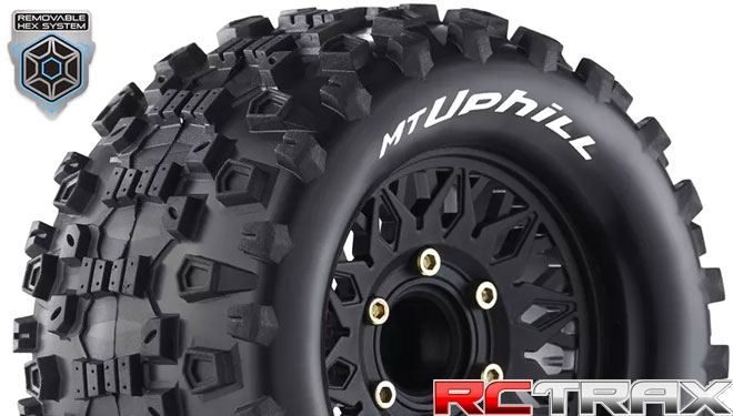Louise RC - MT-UPHILL - 1-10 Monster Truck Tire Set - Mounted - Sport - Black Wheels - Removable HEX 12 Narrow, 12 Wide, 14, 17mm - L-T3204SX