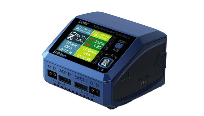 Ładowarka SkyRC D100neo wyposażona jest w 2 porty, umożliwiające jednoczesne ładowanie z mocą 200 W przy wykorzystaniu zasilania DC. Obsługuje różnorodne typy akumulatorów, w tym LiPo, LiFe, Li-ion, LiHV, NiMH, i NiCd i zapewnia funkcję balansowania napięcia na poziomie ±0.02V. Na wydajność urządzenia wpływa także kolorowy wyświetlacz o wysokiej rozdzielczości i interfejs, zapewniający łatwość obsługi. Produkt wyposażono również w port USB-C z funkcją Power Delivery 20 W do szybkiego ładowania. Za bezpieczeństwo użytkowania odpowiadają zaawansowane funkcje ochronne.
