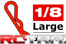High quality large size color anodised body clips for 1/8 scale RC Racing cars. Made from special spring steel. 45° Bent edge for easy installation and quick removal. Red anodised color. Blister packed 10 pcs