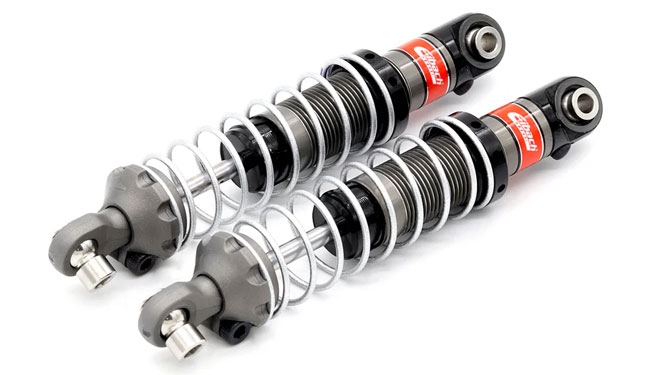 Dolna pokrywę wkładu wkręca się teraz w dolną część obrabianego maszynowo aluminiowego korpusu i zachowuje podwójny zestaw uszczelek typu O-ring. Obrabiany maszynowo tłok jest osadzony na polerowanym stalowym wałku i zabezpieczony śrubą M2X5 mm zamiast standardowych zacisków E-clips. Srebrne sprężyny i szare, anodowane na twardo korpusy amortyzatorów z grawerowanym laserowo logo Eibach dopełniają autentyczny wygląd Eibach i zapewniają wykończenie zgodne ze skalą.