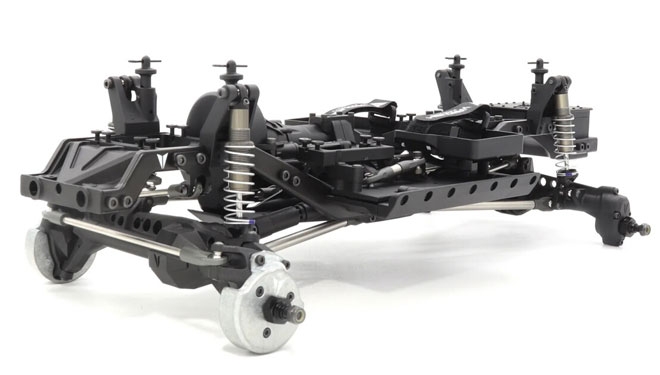 Podwozie Vanquish Products VS4-10 łączy w sobie wygląd skali z wysoką wydajnością. Jego stalowa konstrukcja C-channel oferuje detale skali i wytrzymałość, z podwójnymi mocowaniami serwa, prowadzeniem liny wyciągarki. Formowane suwaki Rock Sliders mają wymienną stożkową część zewnętrzną. Obrabiane maszynowo aluminiowe mocowanie Panharda wytrzymuje silne uderzenia na trasie. Formowane wieże amortyzatorów zabezpieczają amortyzatory Incision S8E o średnicy 80 mm. W zestawie znajdują się również końcówki drążków Pro.