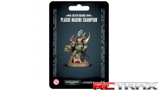 This multi-part plastic kit contains the components necessary to assemble a Plague Marine Champion, who can be added to a unit of Plague Marines. Clad in bulging, rusted power armour, he comes with a choice of two variant heads – one helmeted, and one bare (with an unsettlingly large horn growing out of his face…). Befitting his Champion status, he is decked out in chainmail, with a cloak prominently featuring the symbol of Nurgle. He is armed with a plaguesword and power fist, and includes a boltgun which hangs from his backpack. 2 Nurglings are included – one atop his shoulder, clutching a smoking censer, and one optional Nurgling for his base, comically clad in a Death Guard helmet.